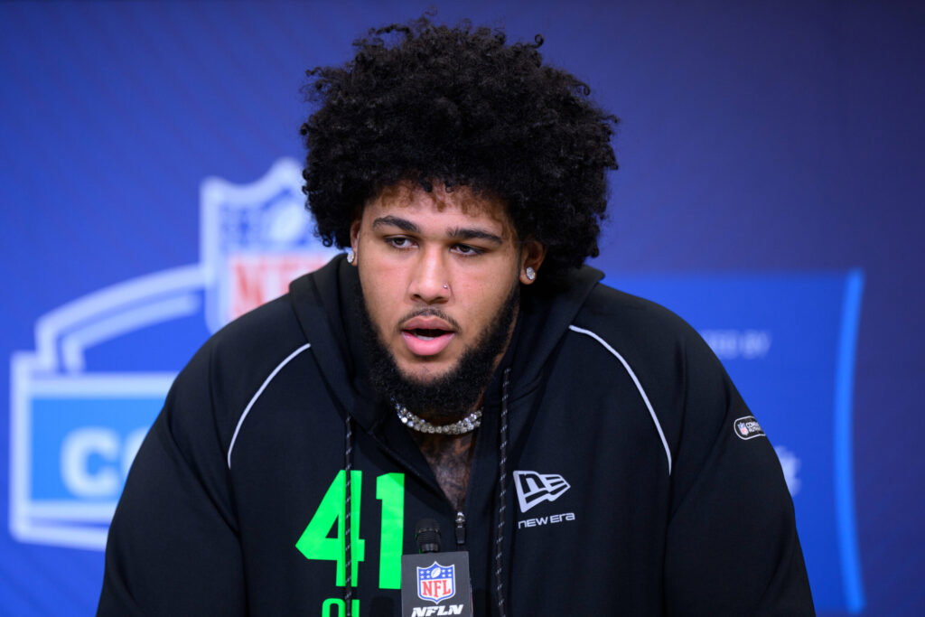 INDIANAPOLIS, IN - FEBRUARY 28: Alabama offensive lineman Kadyn Proctor answers questions from the media during the NFL, American Football Herren, USA Scouting Combine on February 28, 2026 at the Indiana Convention Center in Indianapolis, IN. Photo by Zach Bolinger/Icon Sportswire NFL: FEB 28 Scouting Combine EDITORIAL USE ONLY Icon2602280459