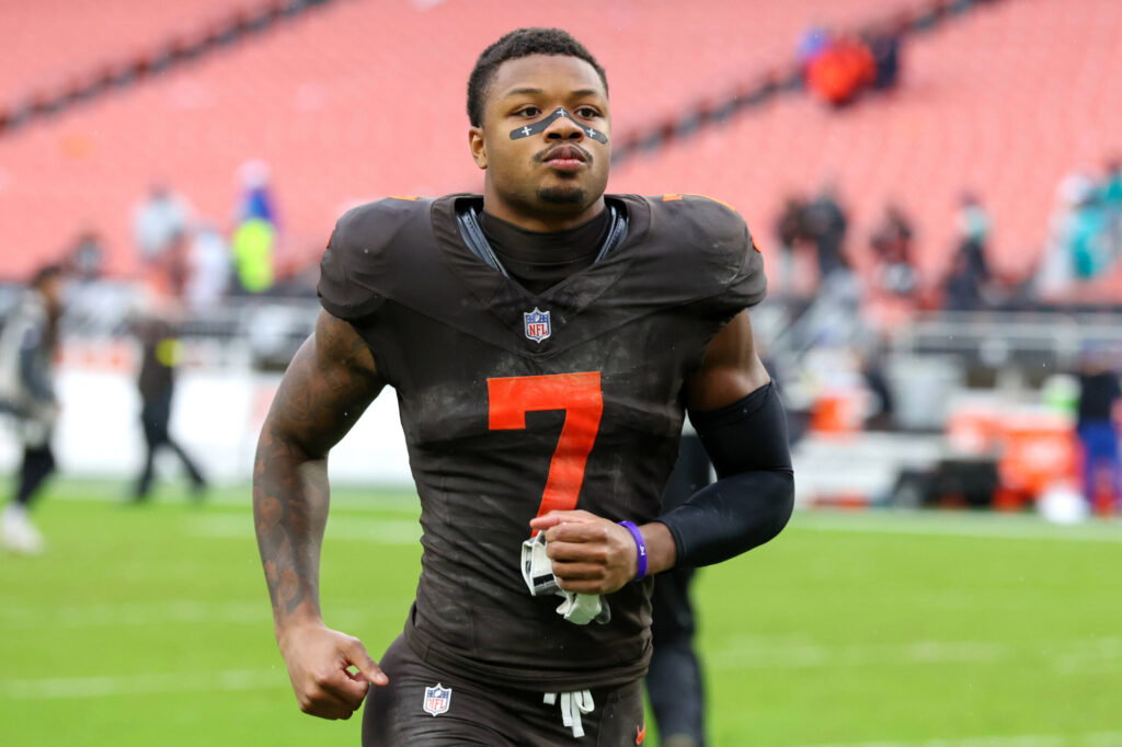 CLEVELAND, OH - OCTOBER 19: Cleveland Browns cornerback Tyson Campbell 7 leaves the field following the National Football League game between the Miami Dolphins and Cleveland Browns on October 19, 2025, at Huntington Bank Field in Cleveland, OH. Photo by Frank Jansky/Icon Sportswire NFL, American Football Herren, USA OCT 19 Dolphins at Browns EDITORIAL USE ONLY Icon251019140