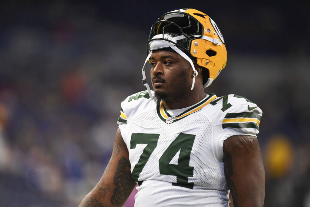 INDIANAPOLIS, IN - AUGUST 16: Green Bay Packers Offensive Lineman Elgton Jenkins 74 warms up for the NFL, American Football Herren, USA preseason game between the Green Bay Packers and the Indianapolis Colts on August 16, 2025, at Lucas Oil Stadium in Indianapolis, Indiana. Photo by Michael Allio/Icon Sportswire NFL: AUG 16 Preseason Packers at Colts EDITORIAL USE ONLY Icon116250816051