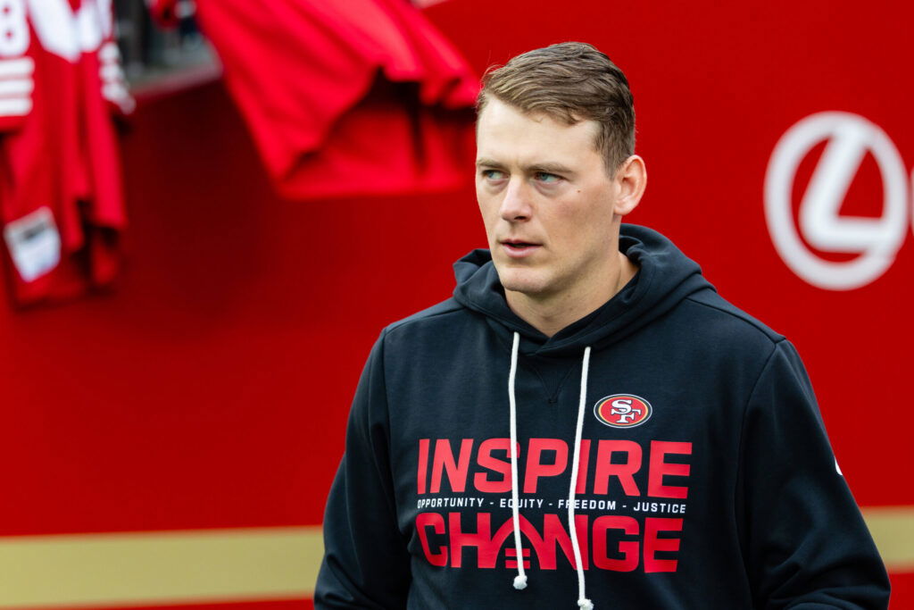 SANTA CLARA, CA - DECEMBER 14: Mac Jones, 10 of the San Francisco 49ers, looks on before an NFL, American Football Herren, USA game between the Tennessee Titans and the San Francisco 49ers on December 14, 2025, at Levi s Stadium in Santa Clara, CA. Photo by Matthew Huang/Icon Sportswire NFL: DEC 14 Titans at 49ers EDITORIAL USE ONLY Icon251214033