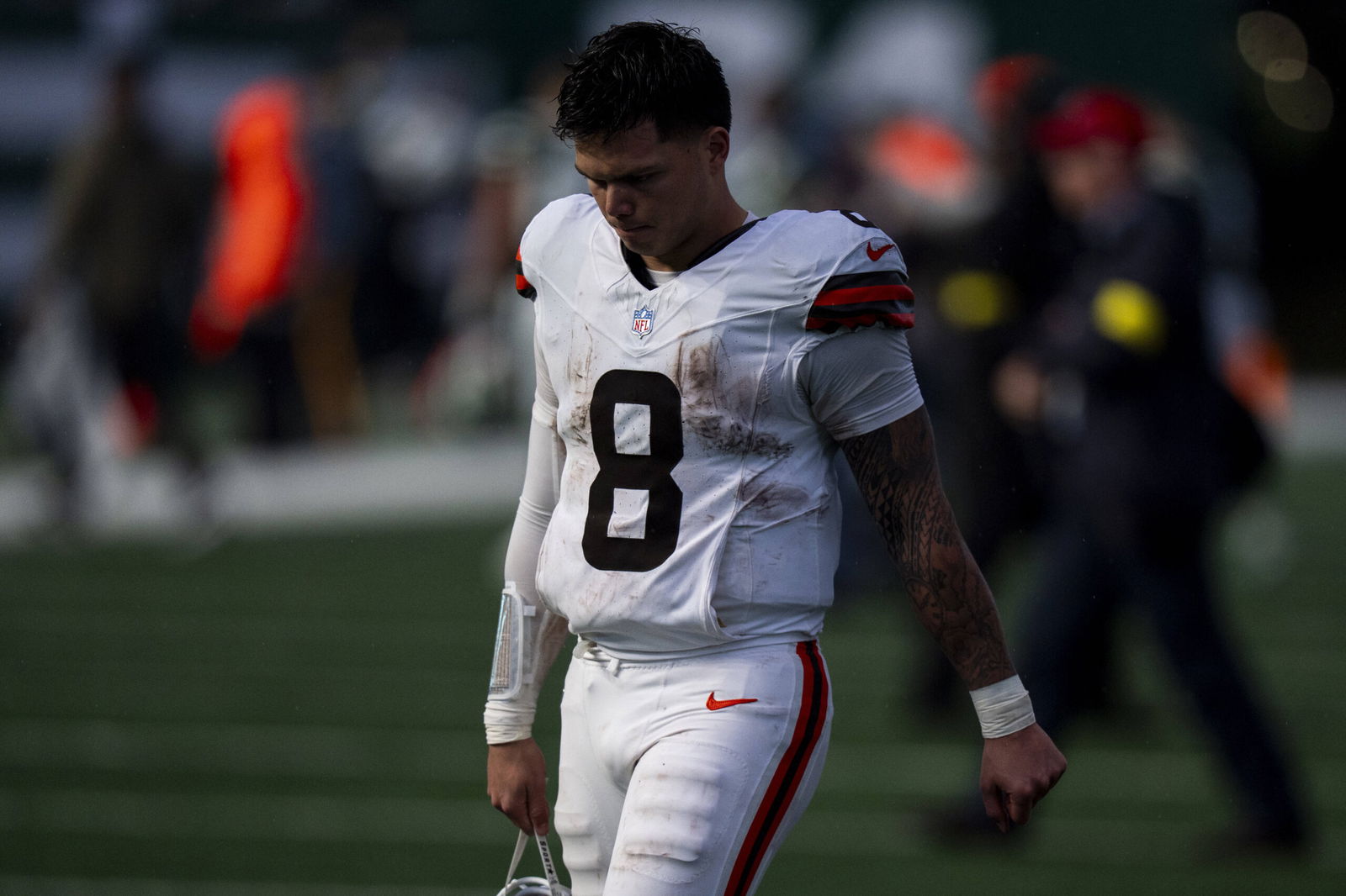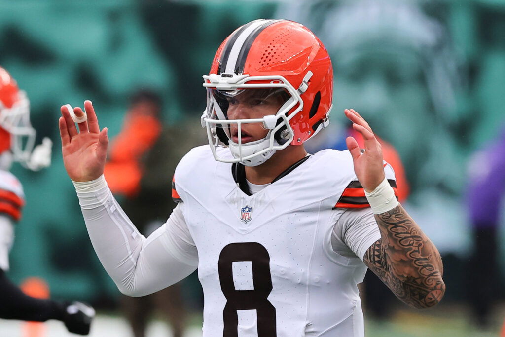 EAST RUTHERFORD, NJ - NOVEMBER 09: Dillon Gabriel 8 of the Cleveland Browns during the game against the New York Jets on November 9, 2025 at MetLife Stadium in East Rutherford, New Jersey. Photo by Rich Graessle/Icon Sportswire NFL, American Football Herren, USA NOV 09 Browns at Jets EDITORIAL USE ONLY Icon25110919980