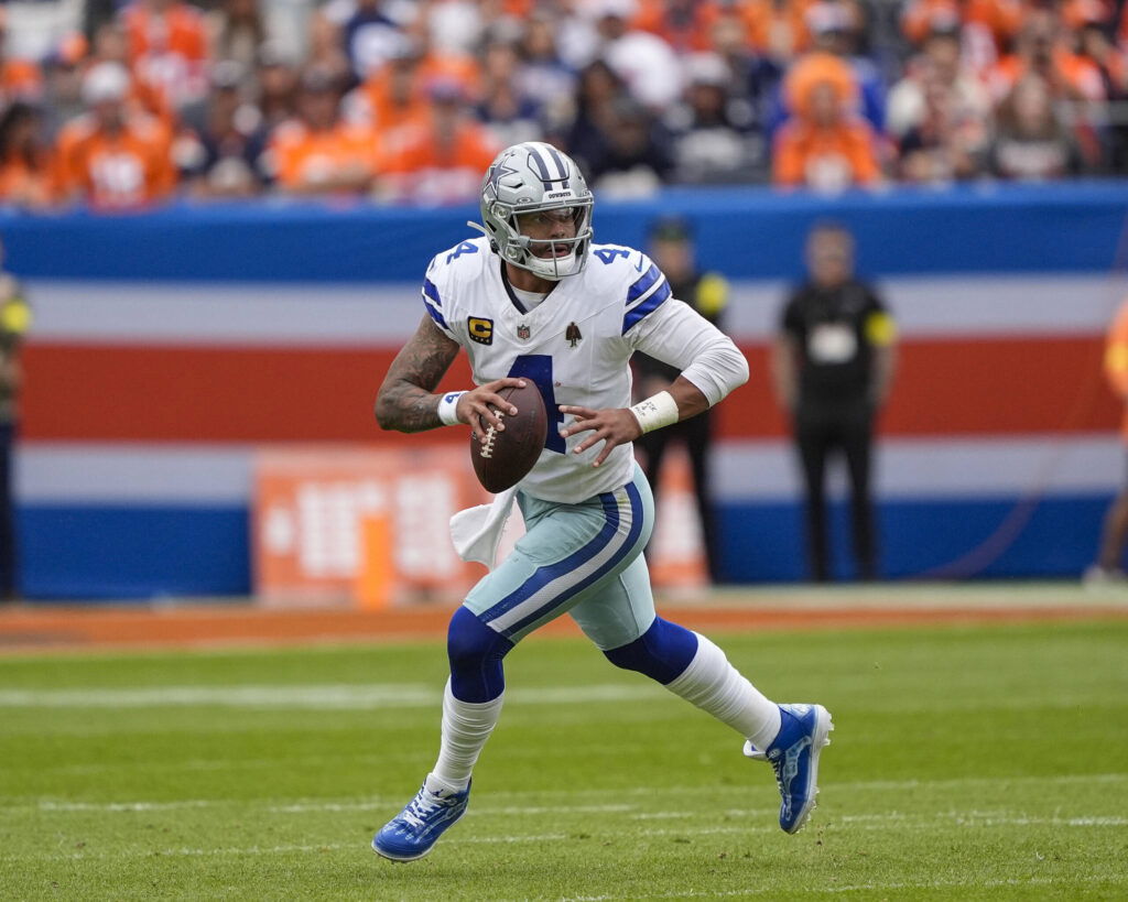 October 26, 2025: Dallas Cowboys quarterback Dak Prescott 4 scrambles trying to find an open man in the first half of the football game between the Denver Broncos and Dallas Cowboys. /CSM. - ZUMAc04_ 20251026_zma_c04_191 Copyright: xDerekxRegensburgerx