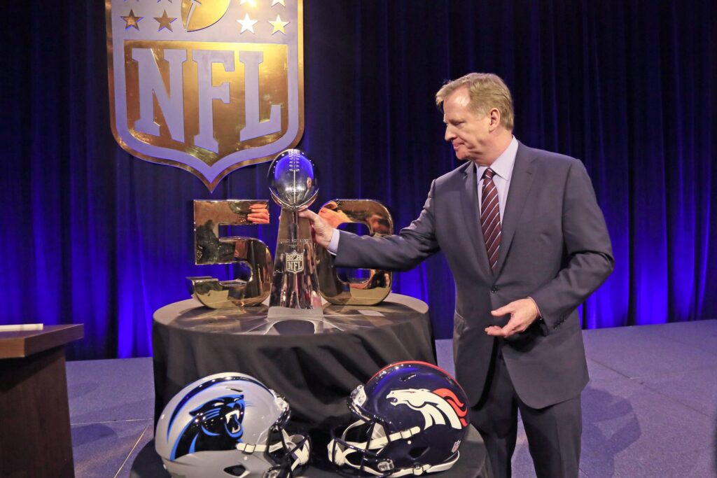 Bilder des Tages - SPORT NFL American Football Herren USA Commissioner Roger Goodell mit der Vince Lombardi Trophy - Super Bowl 50 NFL Commissioner Pressekonferenz, Moscone Center San Francisco Images the Day Sports NFL American Football men USA Commissioner Roger Goodell with the Vince Lombardi Trophy Super Bowl 50 NFL Commissioner Press conference Moscone Center San Francisco