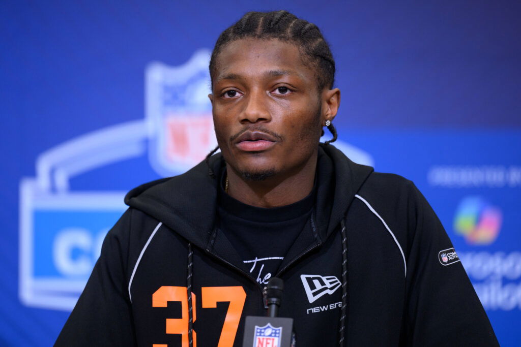 INDIANAPOLIS, IN - FEBRUARY 27: Ohio State wide receiver Carnell Tate answers questions from the media during the NFL, American Football Herren, USA Scouting Combine on February 27, 2026 at the Indiana Convention Center in Indianapolis, IN. Photo by Zach Bolinger/Icon Sportswire NFL: FEB 27 Scouting Combine EDITORIAL USE ONLY Icon2602270869