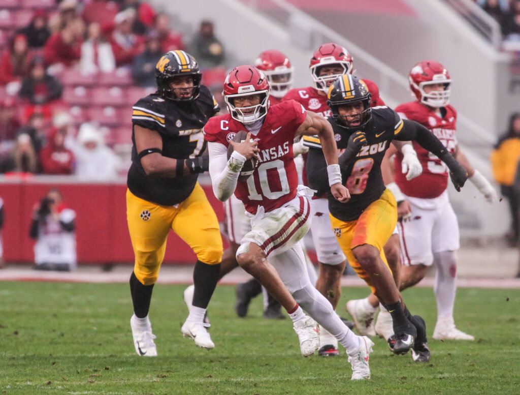 November 29, 2025, Fayetteville, Arkansas, USA: Arkansas Razorbacks quarterback TAYLEN GREEN 10 rushes on a keeper during Missouri s win over Arkansas Razorbacks at Donald W. Reynolds Razorback Stadium. Fayetteville USA - ZUMAs199 20251129_znp_s199_025 Copyright: xBrentxSoulex