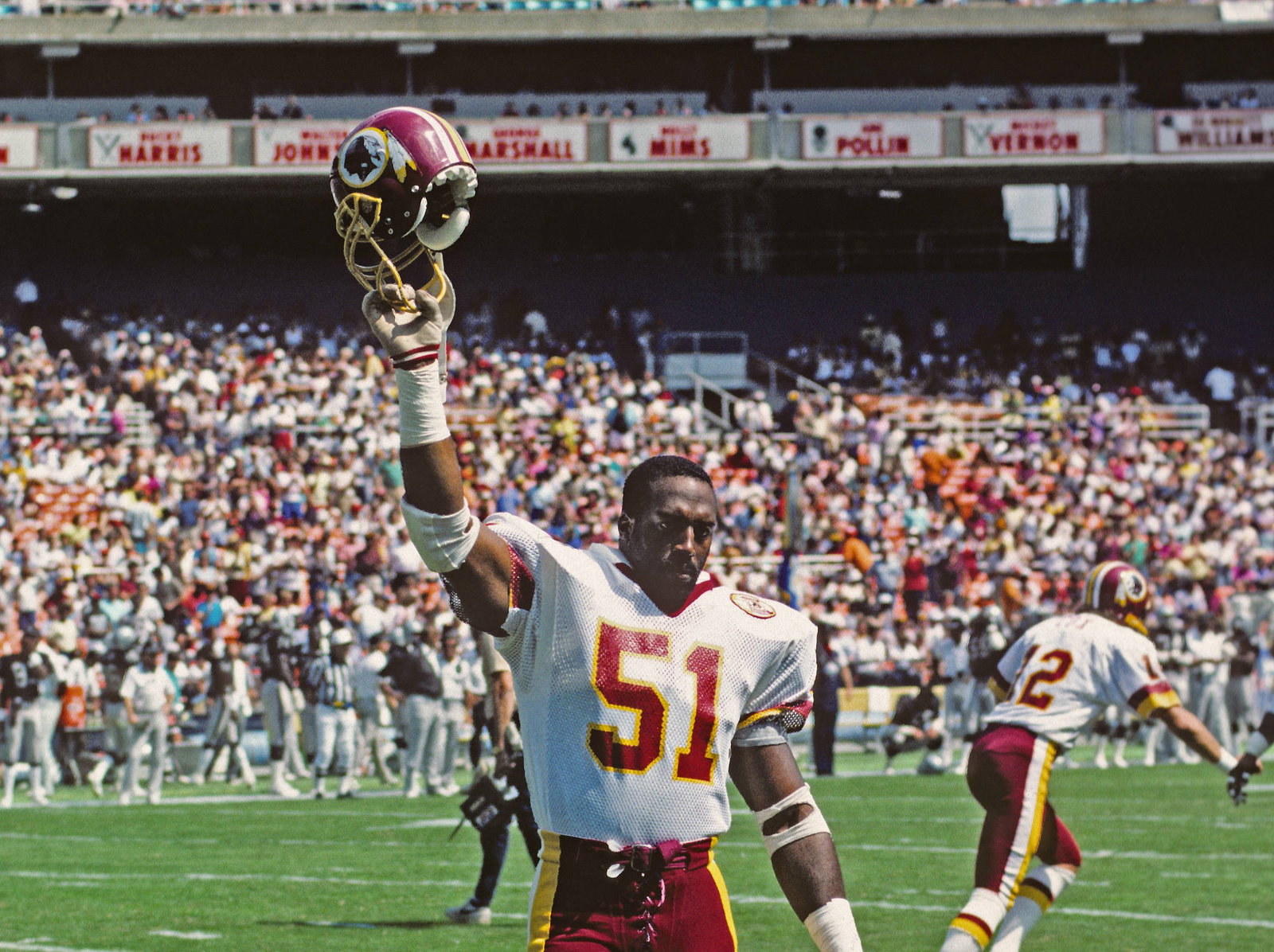 Los Angeles Raiders v. Washington Redskins Washington Redskins linebacker Monte Coleman 51 acknowledges the cheers of fans at RFK Stadium in Washington, D.C. as he returns to the locker room prior to the game against the Los Angeles Raiders on September 14, 1986. Photo by Arnold Sachs / CNP/ABACAPRESS.COM Washington Maryland United States PUBLICATIONxNOTxINxFRAxUK Copyright: xCNP/ABACAx